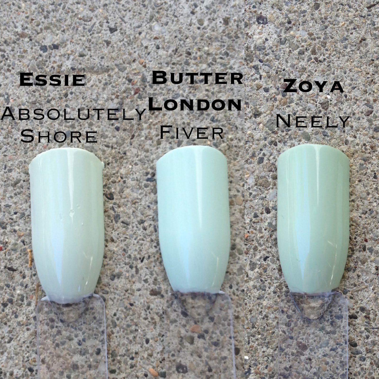 I decided to gather Essie's "Absolutely Shore," Zoya's "Neely" and Butter London's "Fiver" together because they were the most pale of the entire batch.